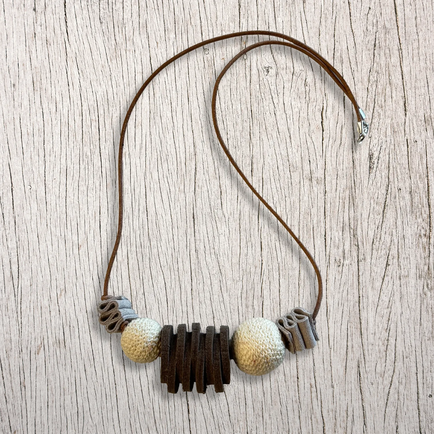 Collana in cuoio, legno e cotone