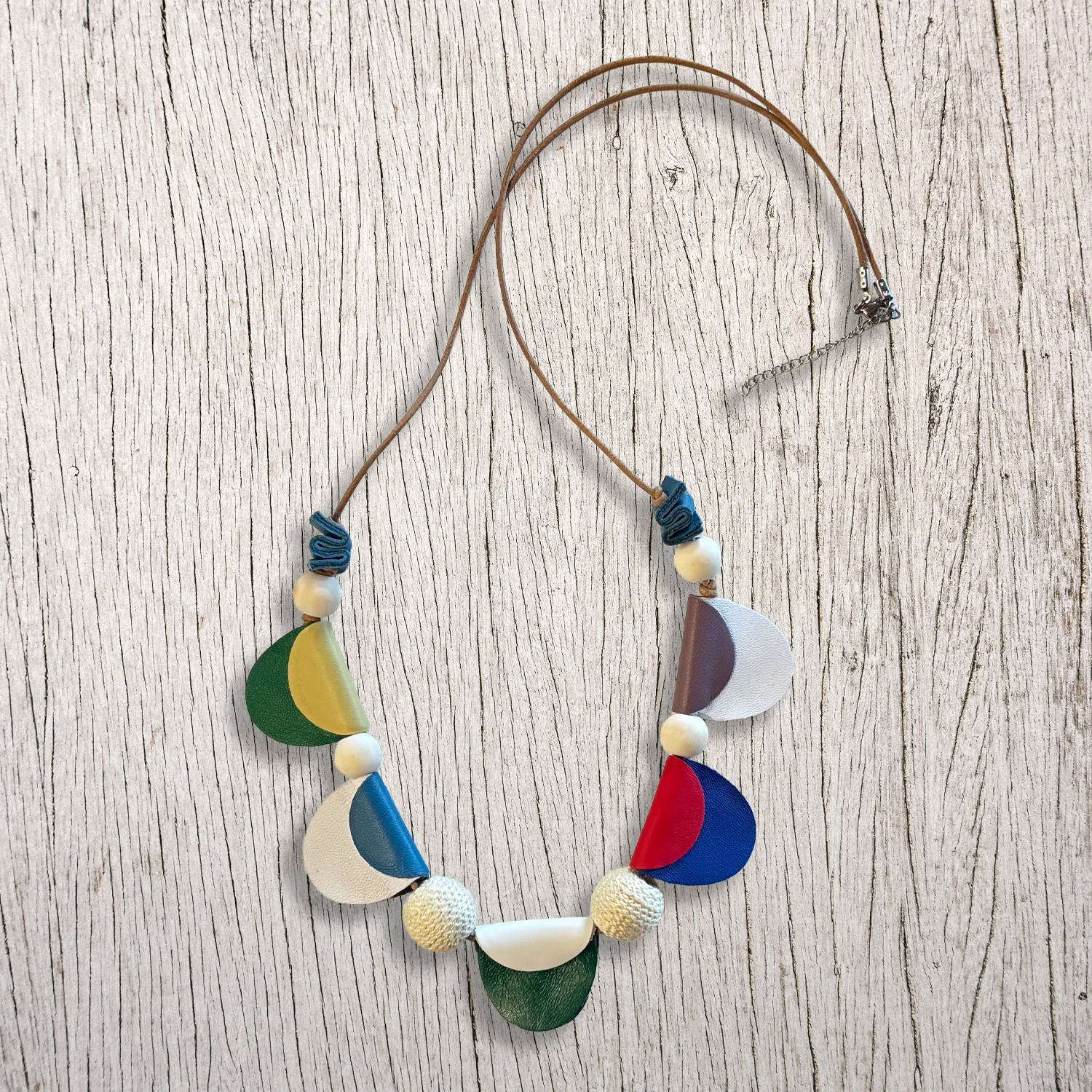 Collana lunga in pelle multicolore con sfere in legno